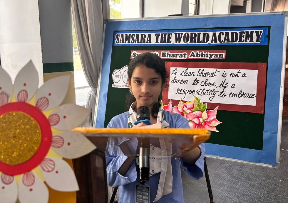 Samsara The World Academy organized a special morning assembly on 29th September 2025, to mark the birth anniversary of Mahatma Gandhi. The programme began with a melodious song, followed by a soulful poem recitation that captured the essence of Gandhiji's timeless values.