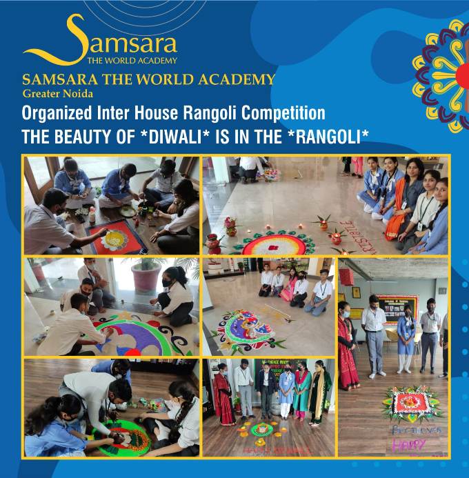 Rangoli, with its vibrant colours and designs, is an integral part of the Diwali celebration. To embellish the festivities of Diwali, Samsara- The World Academy organised the "Inter-House Rangoli Competition" for the students of Grade 9th to 12th on 1st November 2021.