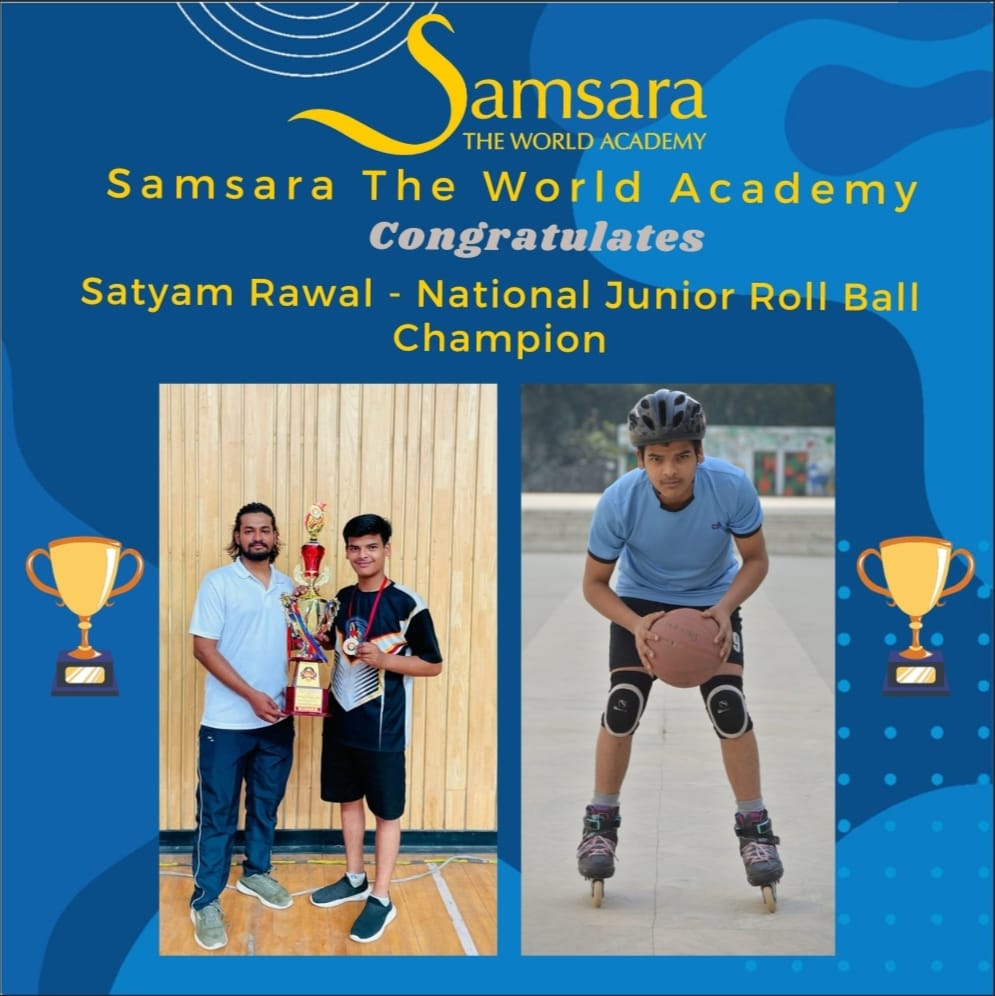 It's a matter of great pride for Samsarians that Satyam Rawal of class IX added a feather in the cap of Samsara-The World Academy, by securing first place in 'Junior Open National Roll Ball Championship - 2023,' held at Pune in Maharashtra. Our respected Management Member Dr. Ameena Amanat ma’am felicitated him in the morning assembly with a medal & certificate. She congratulated him and his mentor.