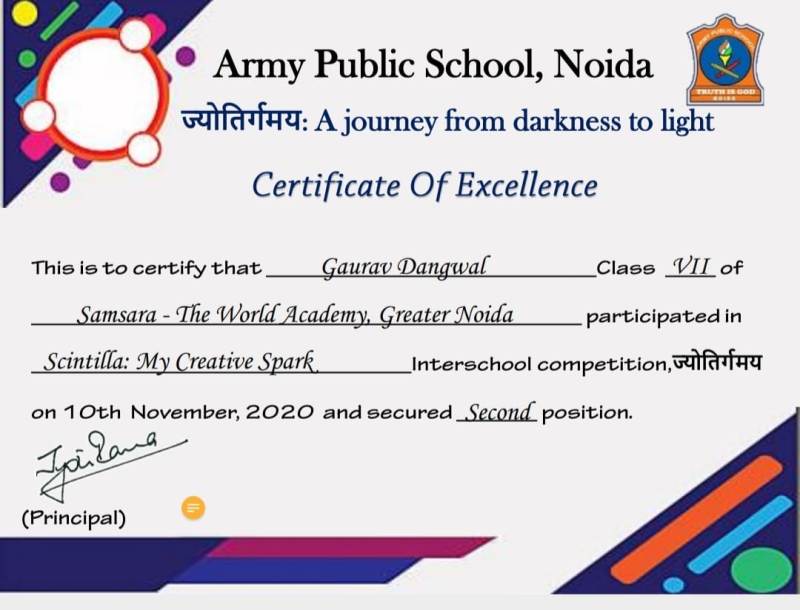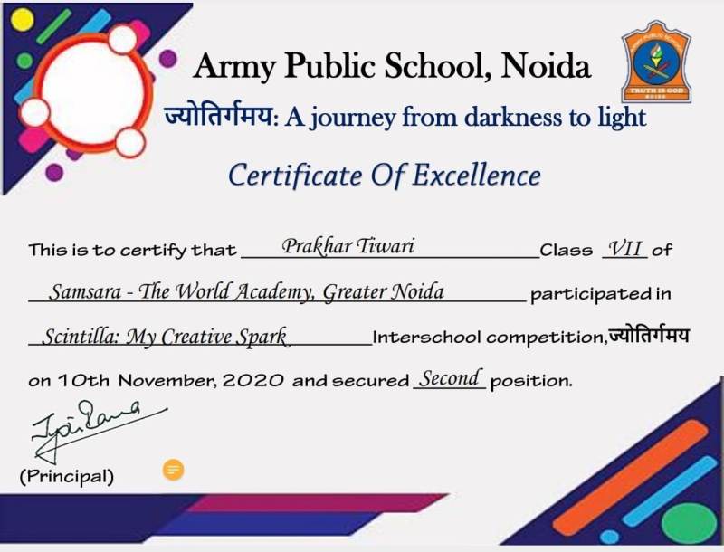 A little victory gives great joys. Samsara-The World Academy feels elated to share that our students brought laurels by winning prizes at an Inter School Competitions organised by Army Public School, Noida, on 10th November, 2020.