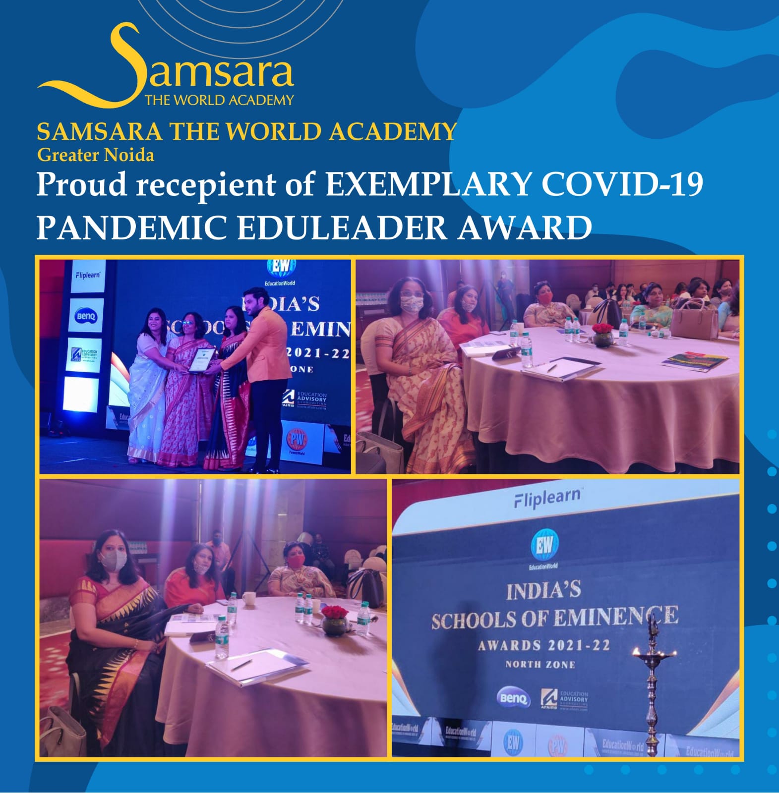 Today, the entire fraternity of Samsara-The World Academy feels elated to announce that our school has been honoured with a prestigious ' Exemplary Covid Pandemic Eduleader Award 2021-22'on 8th October, for strictly following the protocols of Covid19 and becoming true heroes by giving a helping hand to the nation during the unprecedented times of covid 19.