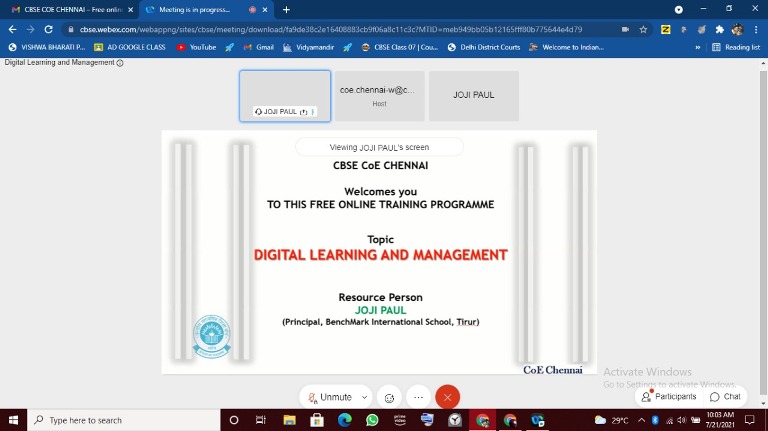 Our facilitator Dr. Pramila Panda, PGT, Physics, attended an online Capacity Building Programme on “Digital Learning and Management” conducted by CBSE, Centre of Excellence - Chennai on 21st July’ 2021.