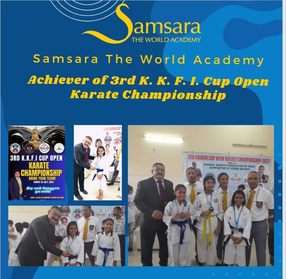 It's a matter of great pride for Samsarians that Pratusha Singh of class VI added a feather in the cap of Samsara The World Academy, by securing a Silver medal in the Kata event and Kumite- Bronze medal in the 3rd K. K. F. I Cup Open Karate Championship held in Noida on 23rd July 2023. Capt. Praveen Roy, the Principal felicitated her in the morning assembly with a medal & certificate. She congratulated her and her mentor.
