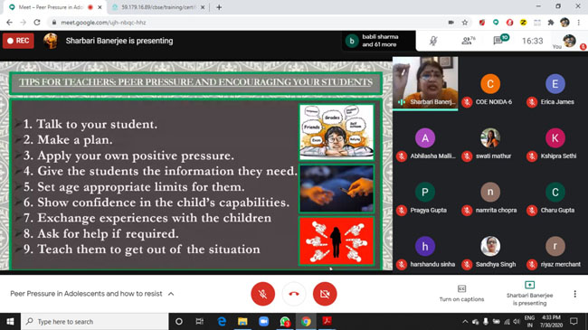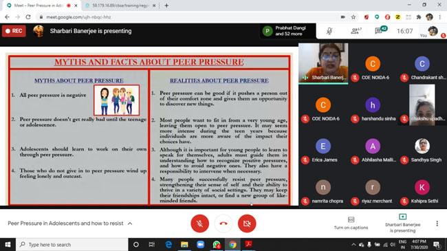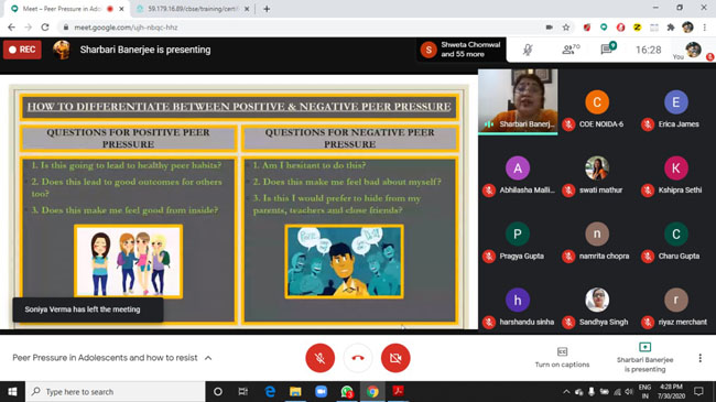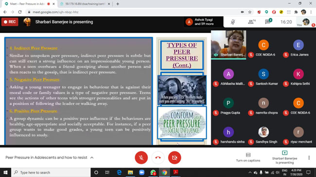 Our Science Facilitator Ms. Pramila Panda attended an online seminar on 'Peer Pressure in Adolescence and How to Resist' on 30th July 2020, organised by CBSE-COE, Noida.