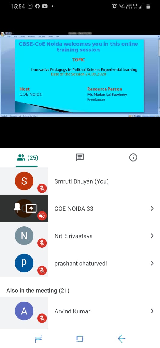 Our facilitator Ms. Smruti Bhuyan, PGT, Political Science, attended an online workshop on 'Innovative Pedagogy in Political Science Experiential Learning' organised by CBSE, on 24th, Sep, 2020.