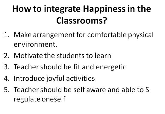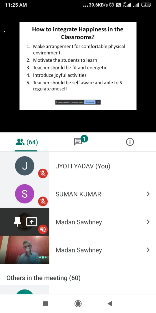The resource person Mr. Madan Sawhney discussed various strategies to create a happy classroom where students feel comfortable, love to listen to their teachers and enjoy the interaction without any stress. He highlighted that integration of happiness in classroom is important to have a congenial environment of learning. He emphasized upon the teachers' skills to make it possible through self regulation techniques and by conducting joyful activities in the class.