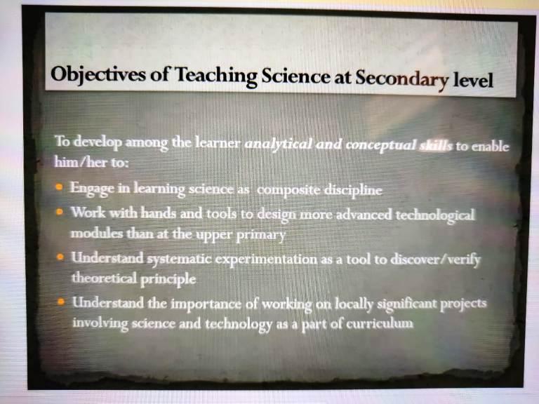 The resource person Ms. Rajni Ashat laid emphasis on lesson plans with the objectives and outcomes of teaching Science. She said that planning should be child centric which involves experiential learning by demonstrating and including experiments which foster the students in understanding the concepts in a better and effective way. She also explained the participants about Bloom's Taxonomy, and urged teachers to introduce it in the class so that the students fully involve in the learning process.