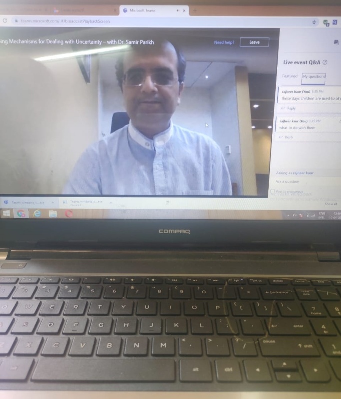 Our teacher Ms. Rajbeer Kaur attended an online session on 'Coping Mechanism and Dealing with Uncertainty' on 10th April, 2020. It was initiated by Macmillian. The resource person Dr. Samir Parikh, Psychiatrist (Mental Health and Behavioral Sciences, Fortis Healthcare) conducted the session on Coronavirus outbreak. He suggested some tips and to do list to keep ourselves mentally fit during the pandemic.