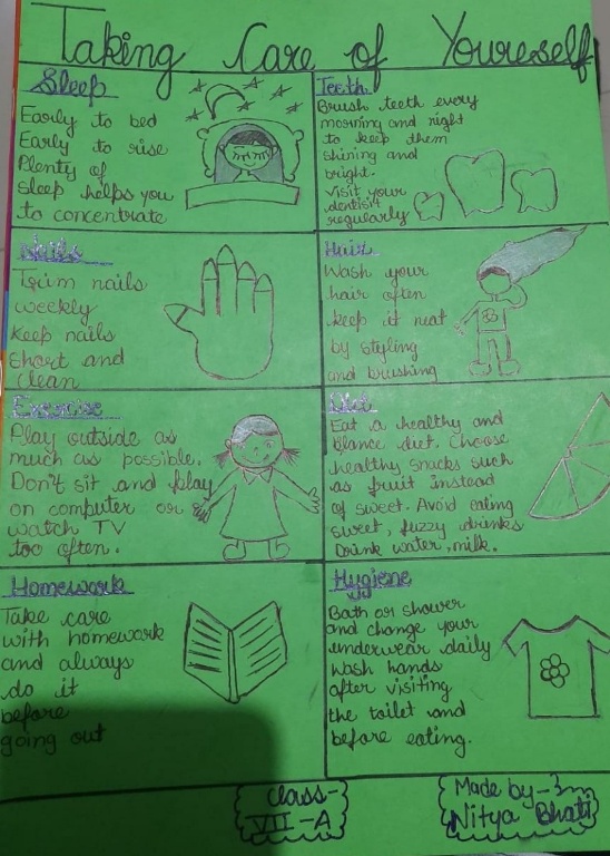 The students of Class VII made beautiful posters on the topic Adequate Health and Hygiene Practices in their Moral Science subject. Students shared their knowledge with the help of the posters and also emphasised on adopting adequate health and hygiene practices in daily life as It's very important to keep ourselves healthy and disease free. |