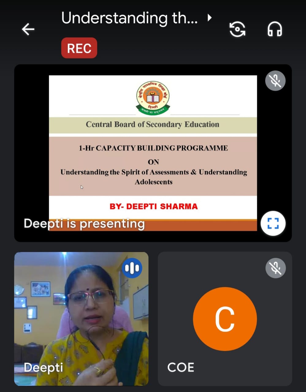 Our English Facilitator Ms. Reema Sharma attended an online workshop on 'Assessment & Adolescence' organised by CBSE, Center of Excellence, Noida on 27th May, 2021.
