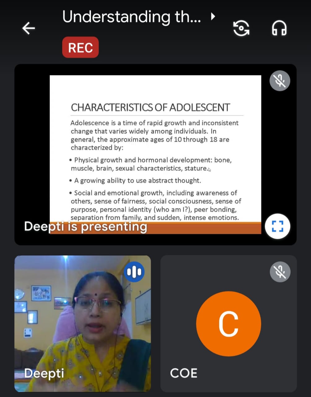 She especially highlighted the purpose, functions and different types of Assessment techniques. She also covered the characteristics of adolescence, its problems and how to overcome them.